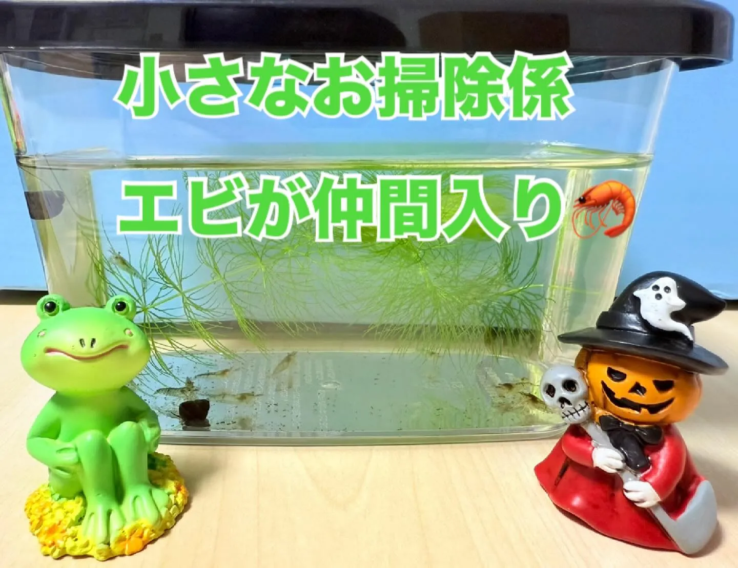 スタッフ同士のやりとりで、メダカの水槽に小エビ(お掃除役) をプレゼントされたそう🦐🐟